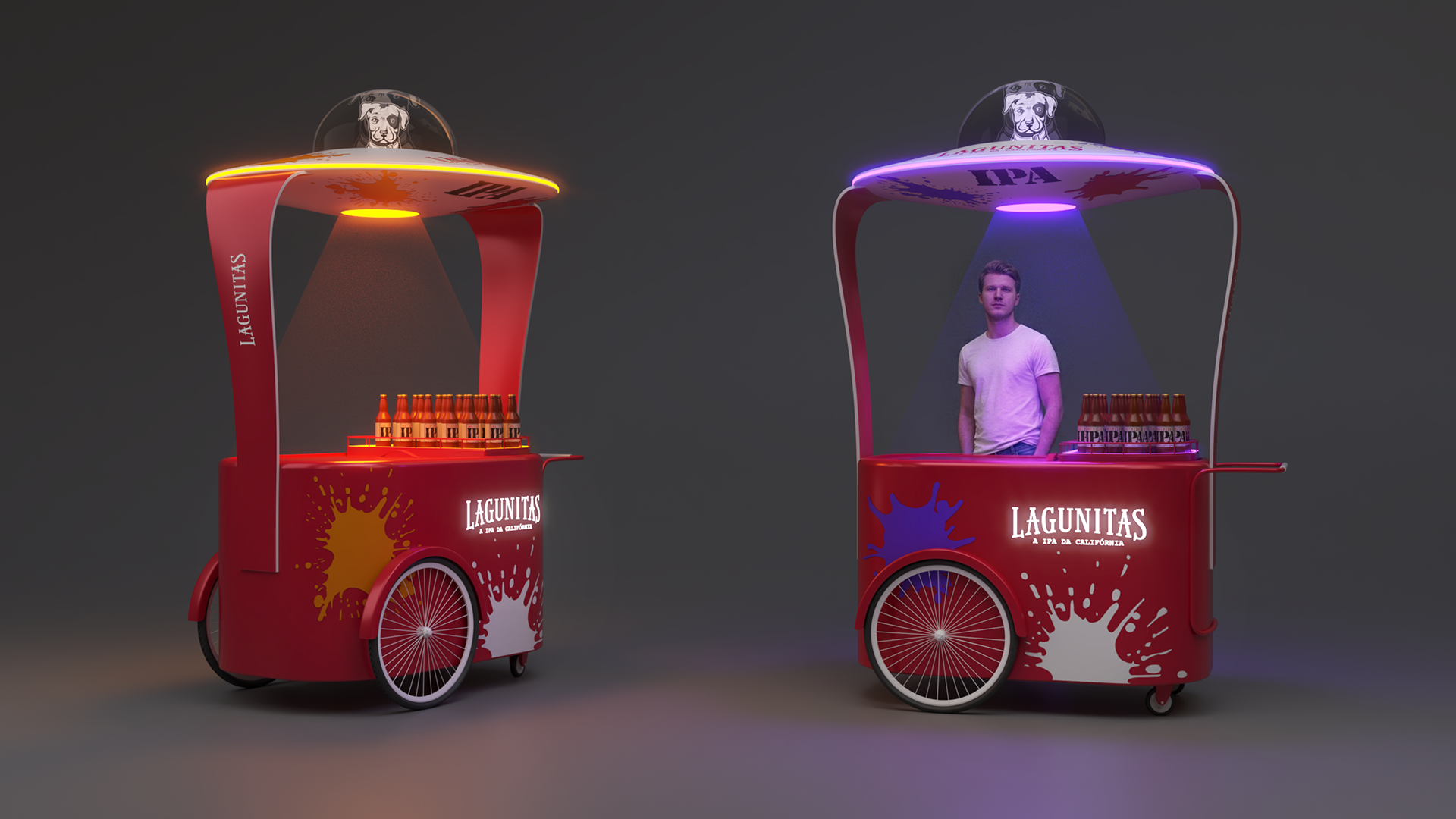 Carrinhos promocionais desenvolvidos para a Agência Onzex, ativações de marca em ambientes urbanos, com foco em visibilidade, mobilidade e engajamento. O projeto combina design de produto e identidade visual para criar experiências de marca dinâmicas e atrativas, adaptadas para diferentes campanhas. Aplicado em projetos para Lagunitas, Amstel, Castas e FYS.